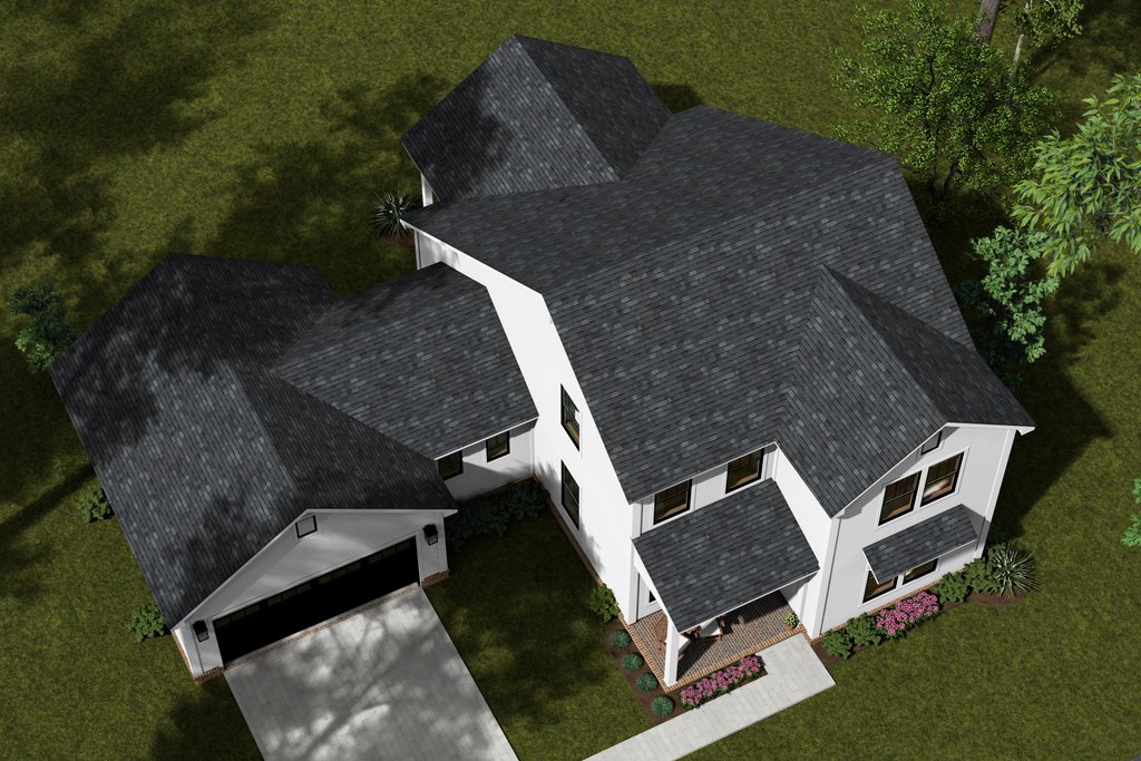 - Overhead Roof Plan(s): A view of the home from above showing roof pitch, peaks, valleys, and other details.