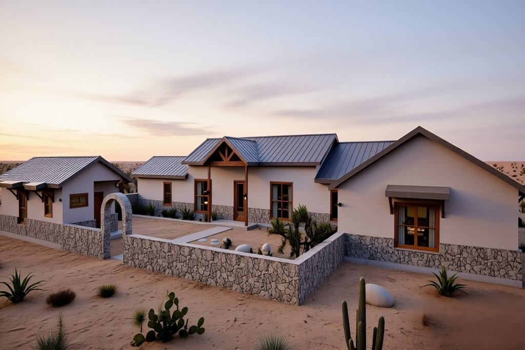 Exterior Wall Finish : Cement-Based Stucco Exterior Finish with 36" Chopped Rock Wainscot