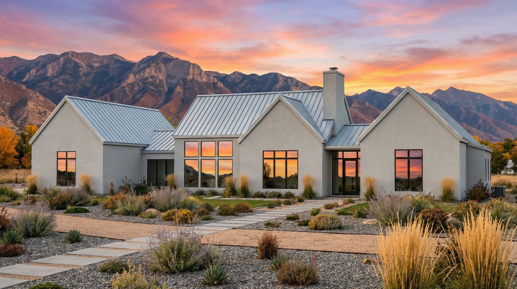 - Exterior Elevations: All elevations are noted, and an aerial view of the roof is provided, showing all hips, valleys, and ridges.