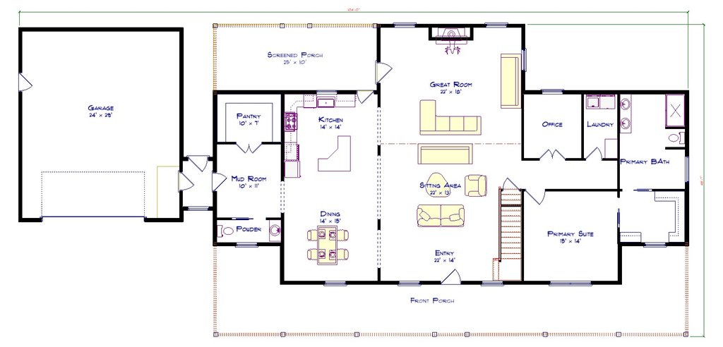 - Foundation Plan: This page shows all necessary notations and dimensions including support columns, walls, and excavated/unexcavated areas.