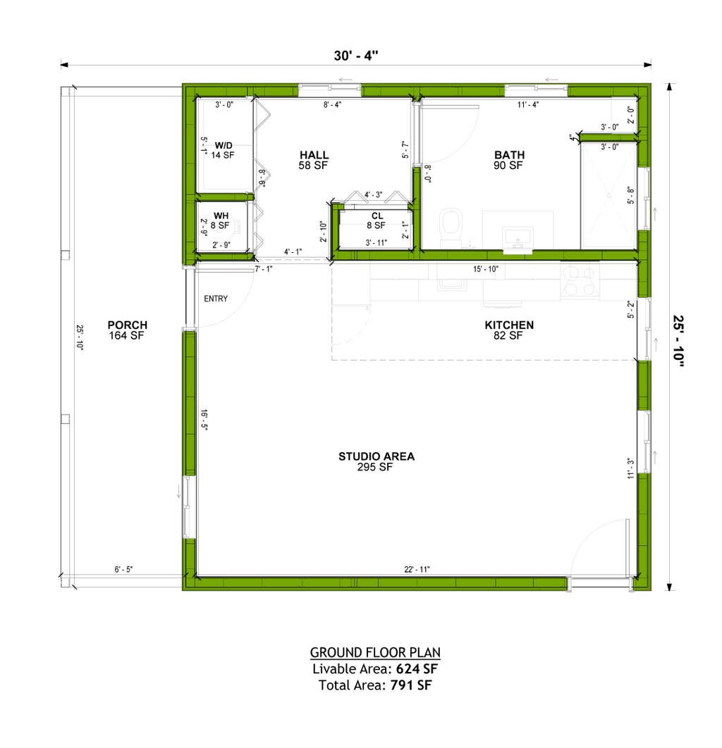 - Foundation Plan: This page shows all necessary notations and dimensions including support columns, walls, and excavated/unexcavated areas.